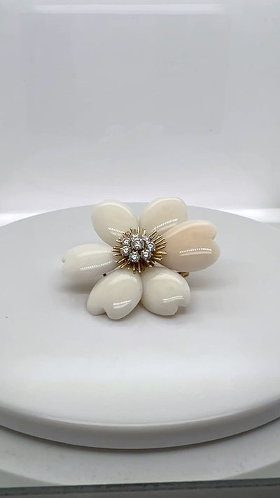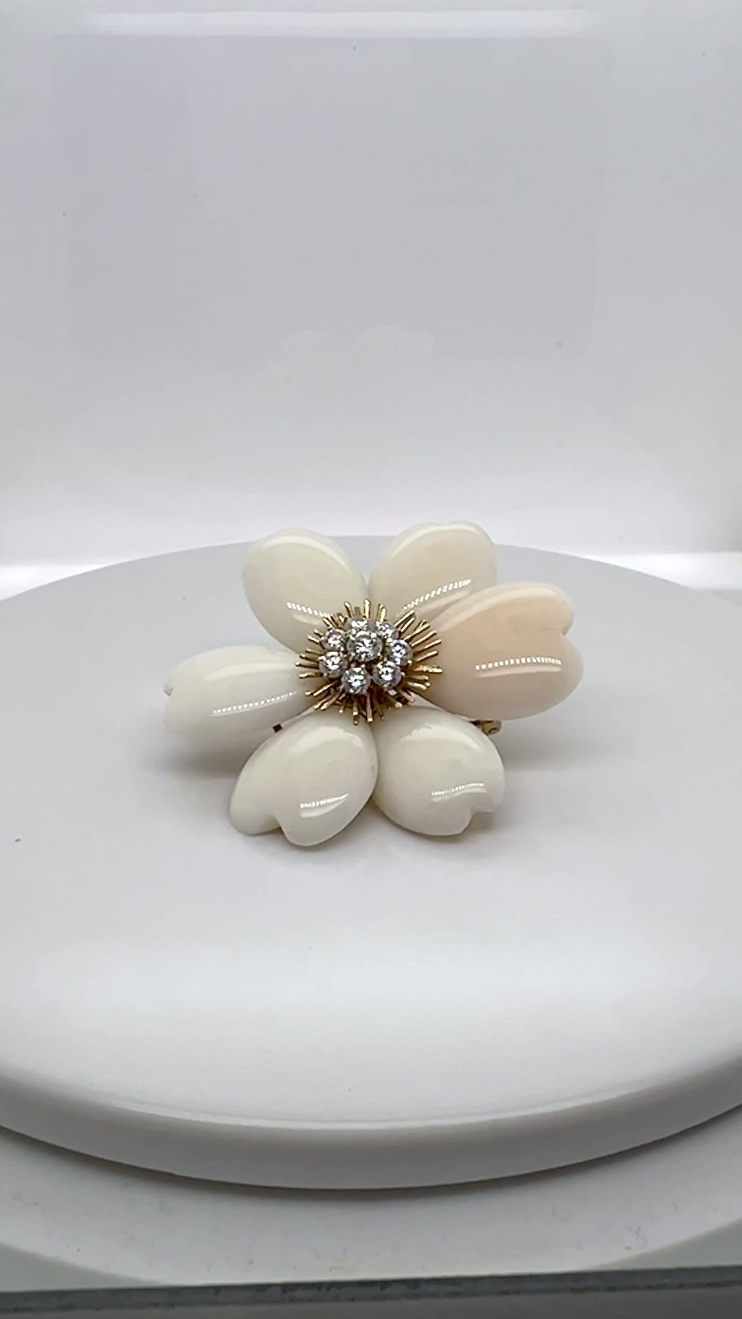 The soft, matte finish of the hand-carved white coral petals forms a graceful blossom, while the center bursts with fiery brilliance from 8 round diamonds. This brooch is ideal for collectors or those seeking a signature accessory with vintage charm.