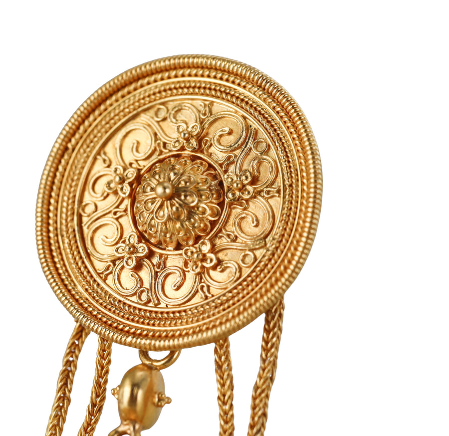 Pair of Greek made Etruscan style earrings, in 18k yellow gold, the earrings feature Cherubs and drop columns. Earrings measure 2.5" x 1 1/8" in diameter of the top circle. Tested 18k, not marked. Weight - 37.6 grams.